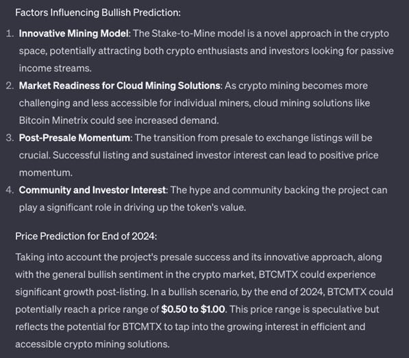 ChatGPT indica, come fattori chiave di crescita di Bitcoin Minetrix, la nuova tokenomics del progetto e il più ampio appetito per la partecipazione al mining di Bitcoin.