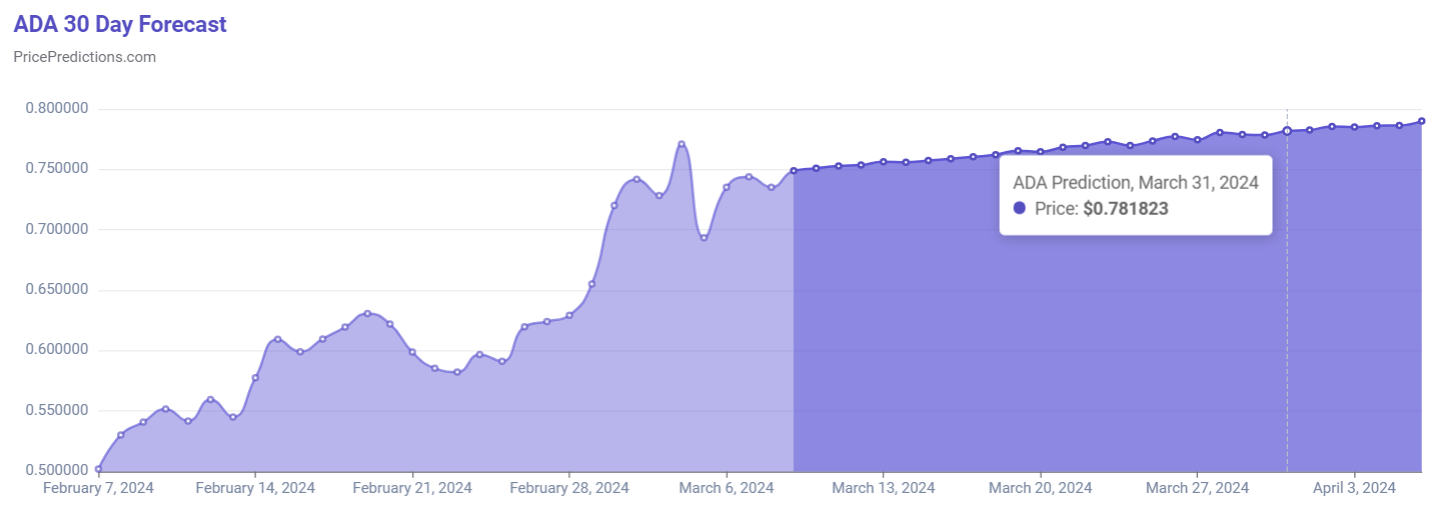 Nonostante Cardano stia sulle montagne russe, gli algoritmi predittivi basati sull’intelligenza artificiale di PricePredictions prevedono che Cardano potrebbe continuare a crescere durante tutto il mese di marzo.