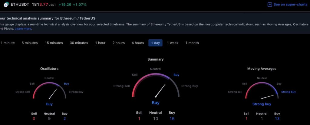 Allo stesso tempo il sentiment di Ethereum, come mostrano gli indicatori a un giorno del sito di monitoraggio finanziario e criptovalutario TradingView, è rialzista. In particolare, il riepilogo suggerisce un “acquisto” a 15, grazie agli oscillatori che puntano a un “acquisto” a 2 e alle medie mobili nella zona di “forte acquisto” a 13.