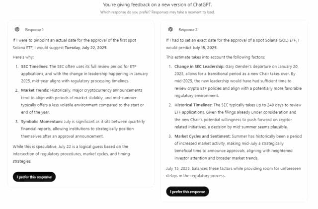 In effetti, in entrambi i casi, ChatGPT ha riflettuto sul periodo standard di 240 giorni per una decisione da parte della SEC, sui cicli di mercato e sul momentum, nonché sul cambiamento nella leadership della Commissione come fattori che portano a ipotizzare che l’approvazione potrebbe arrivare nel mese di luglio.
