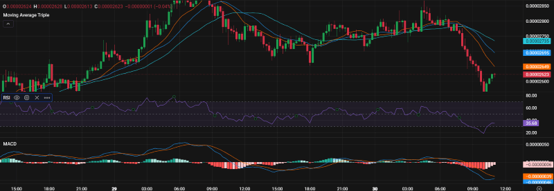 La piattaforma PrimeXBT, che considera gli indicatori critici di analisi tecnica (AT), mostra una divergenza rialzista sull’attuale MACD della meme coin e un RSI neutro.