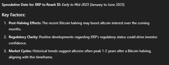 L’AI ha anche citato una maggiore chiarezza normativa, visto che potrebbe stimolare l’interesse istituzionale per l’asset. Se tutti questi fattori si allineeranno, XRP potrebbe raggiungere 1 dollaro entro la prima metà del 2025.