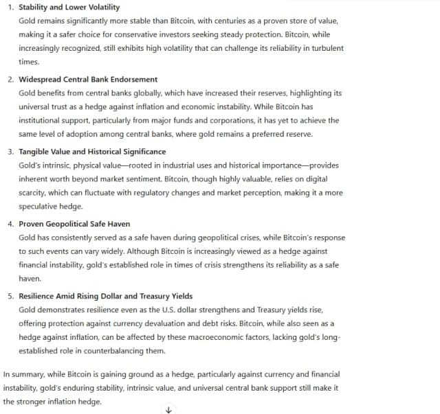 Secondo ChatGPT-4o, la resilienza e il consolidato status di bene rifugio dell’oro lo rendono una scelta solida come copertura contro l’inflazione, soprattutto mentre l’economia globale affronta incertezze fiscali e disordini geopolitici.