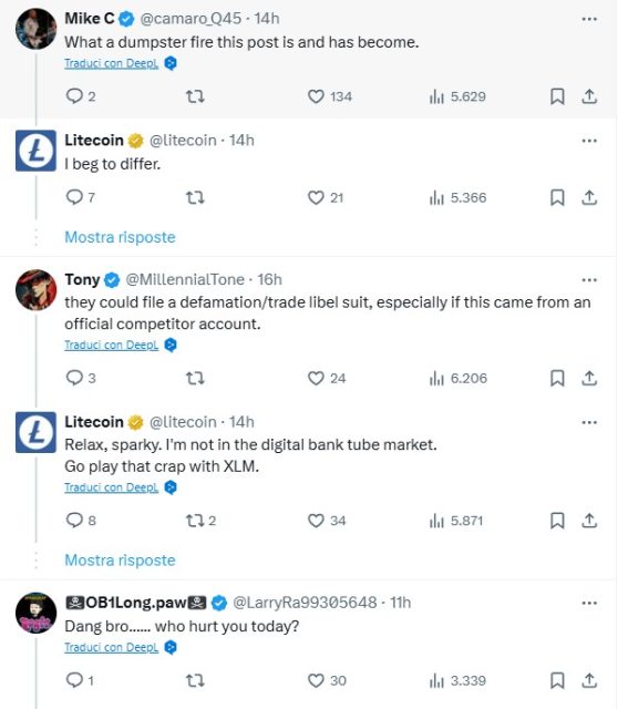 Quando un utente ha sollevato il rischio di “diffamazione commerciale”, l’account di Litecoin ha risposto con sarcasmo: “Rilassati. Non sono nel business dei trasferimenti bancari digitali. Vai a giocare con quelle schifezze di XLM”.