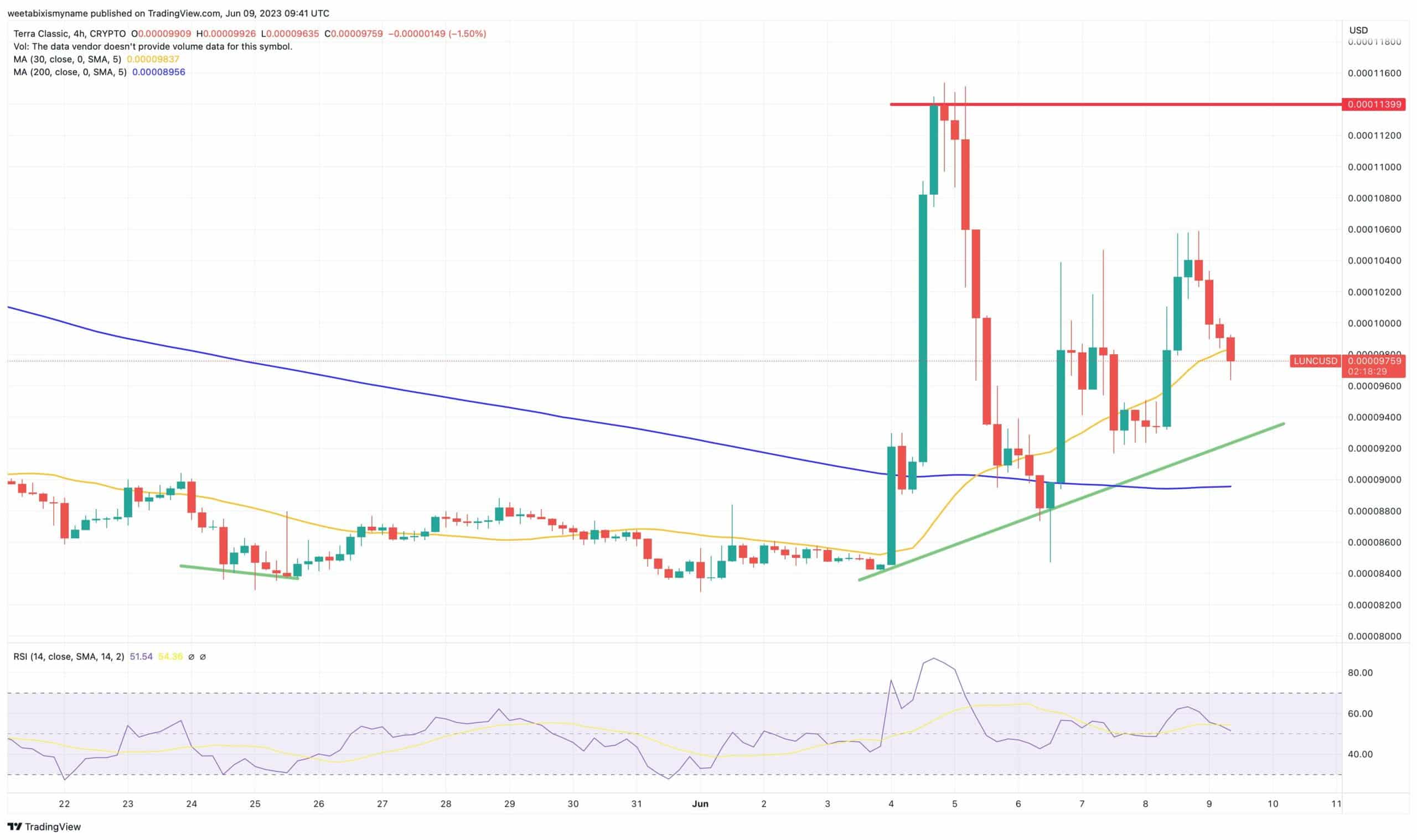 Il resto del mercato, però, si trova in uno stato precario, a causa delle recenti azioni esecutive della SEC, quindi LUNC potrebbe scendere di nuovo nei prossimi giorni o settimane.