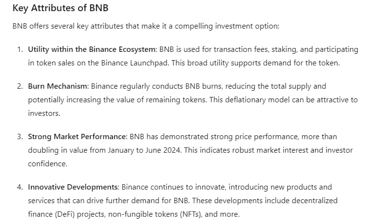 Secondo ChatGPT-4o, BNB è la scelta migliore sia per guadagni a breve termine che per valore a lungo termine nella seconda metà del 2024.