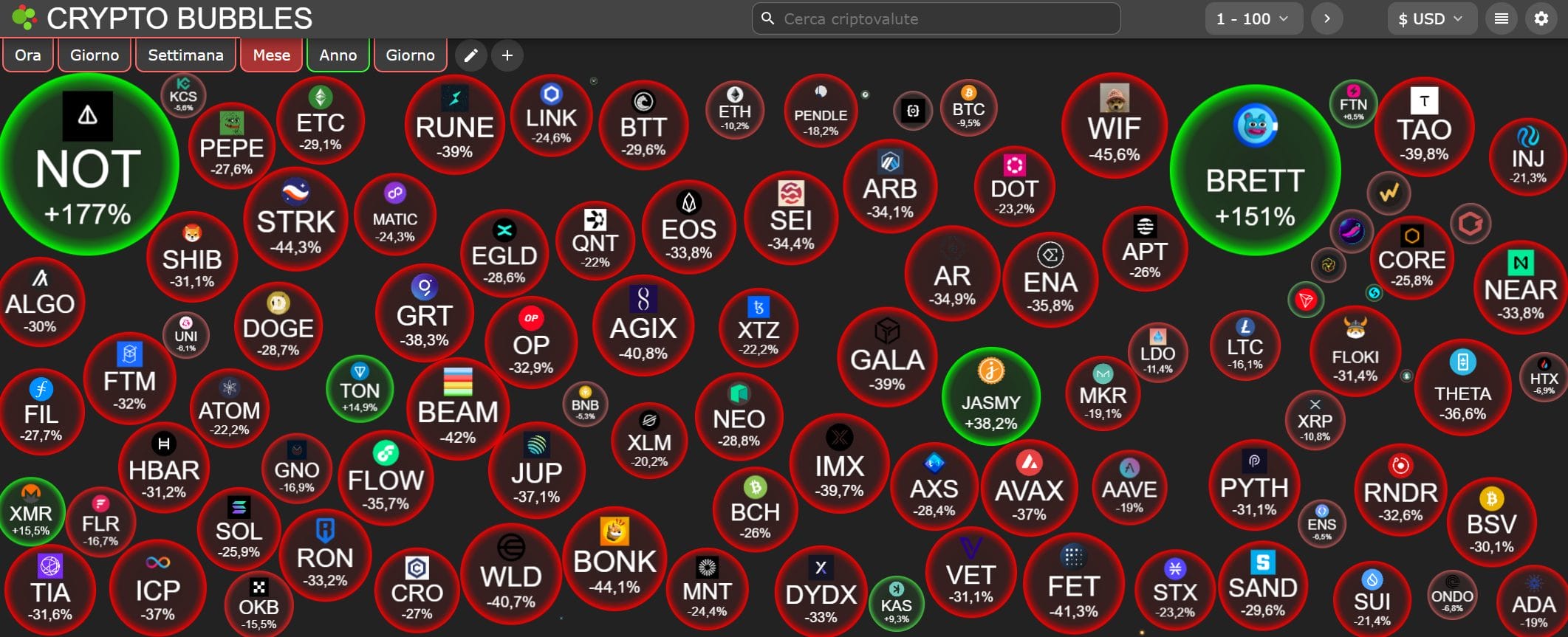 Si salvano solo NOT, che ha avuto una crescita impressionante e non ha subito il ritracciamento, e la meme coin BRETT, ma hanno tenuto bene anche Monero, TON e Jasmy.