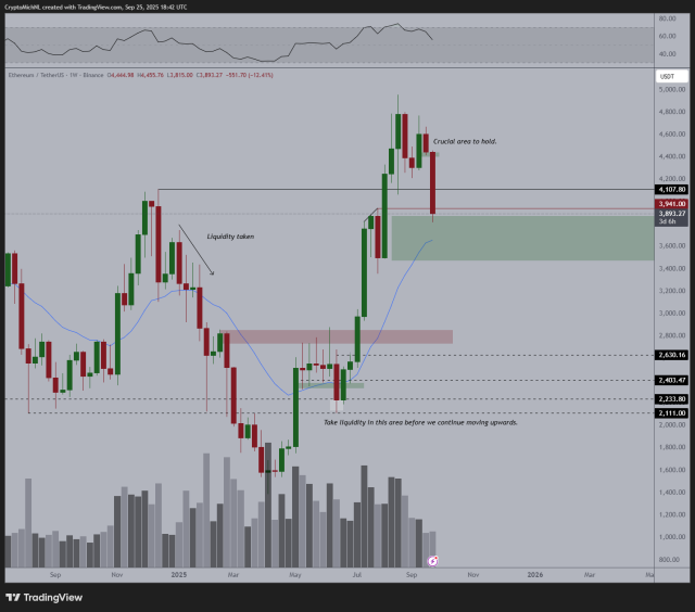 L’analista crypto Ted Pillows ha evidenziato i livelli chiave di supporto e resistenza per Ethereum (ETH) in questa fase di forte volatilità. ETH sta tenendo il supporto nell’area dei 3.822 dollari, il minimo recente. Una rottura al ribasso potrebbe però spingere i prezzi verso i 3.700–3.750 dollari.
