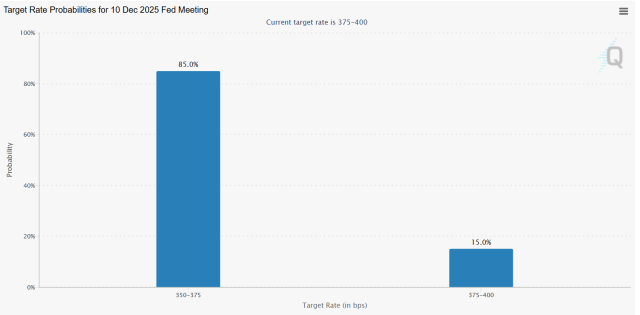 Uno dei motori principali del rialzo odierno è il contesto macroeconomico, le probabilità legate alla prossima riunione della Federal Reserve indicano un cambiamento di sentiment: gli operatori si aspettano un taglio dei tassi già a dicembre, con oltre l’85% degli analisti che prevede una riduzione.