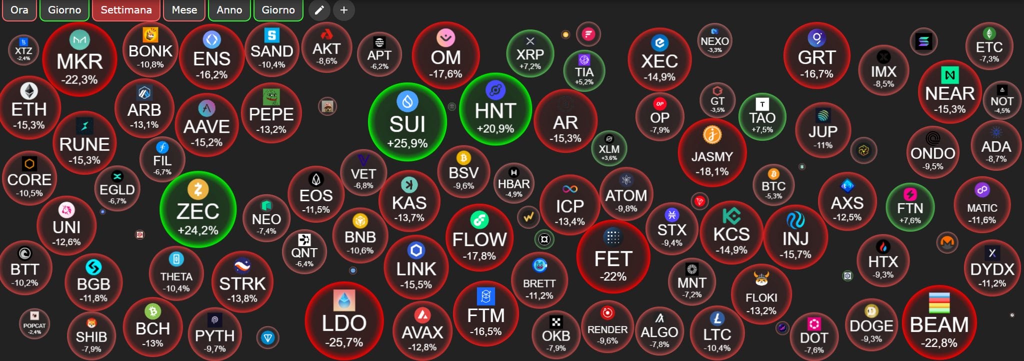 Il grafico settimanale evidenzia però che il mercato è ancora in perdita dopo il crollo, almeno per quanto riguarda le prime 100 altcoin per capitalizzazione.