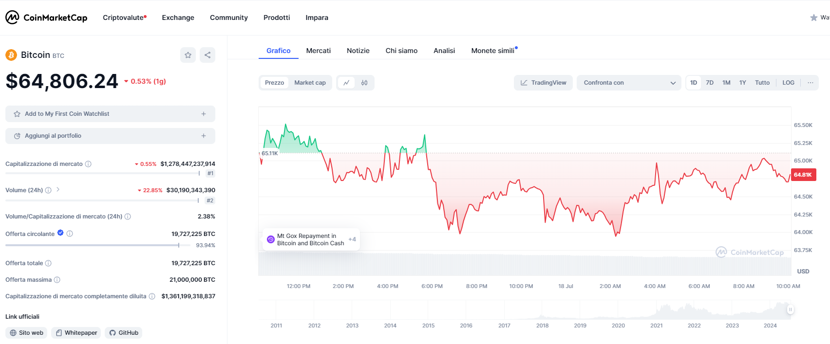 Nel momento in cui scriviamo Bitcoin perde lo 0,5% e rimane stabile sui 64.806 dollari. Il dato settimanale mostra un +11,4%, mentre su base mensile BTC perde l’1,2%.