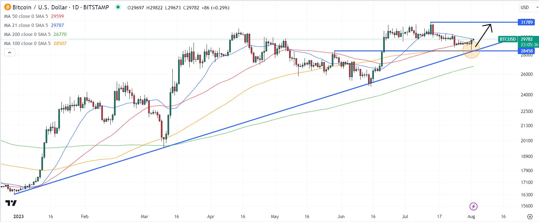 Al prezzo di 29.700 dollari, BTC ha registrato un rialzo superiore al 4%, ovvero 1.200 dollari in più rispetto ai minimi di martedì a 28.500 dollari. Gli analisti tecnici indicano che potrebbero esserci ulteriori guadagni a breve termine.
