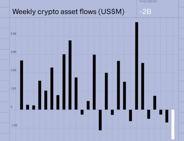 CoinShares ha segnalato che i deflussi dagli ETP crypto hanno toccato i 2 miliardi di dollari, il valore settimanale più alto da febbraio, XRP figura tra i più colpiti.