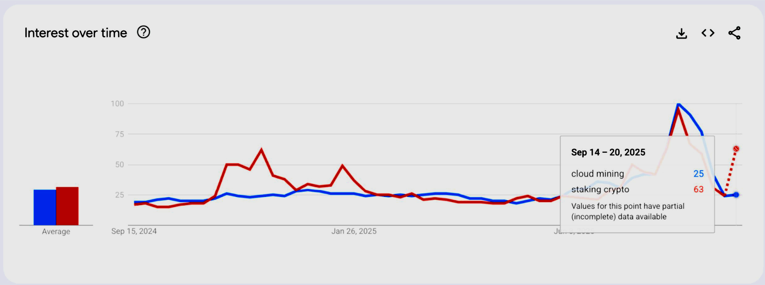Il cloud mining ha registrato un nuovo picco di attenzione, con Google Trends che mostra un’improvviso aumento delle ricerche nel mese di agosto, anche insieme a termini come “staking crypto”, che spesso viene considerato come un’altra forma di reddito passivo.