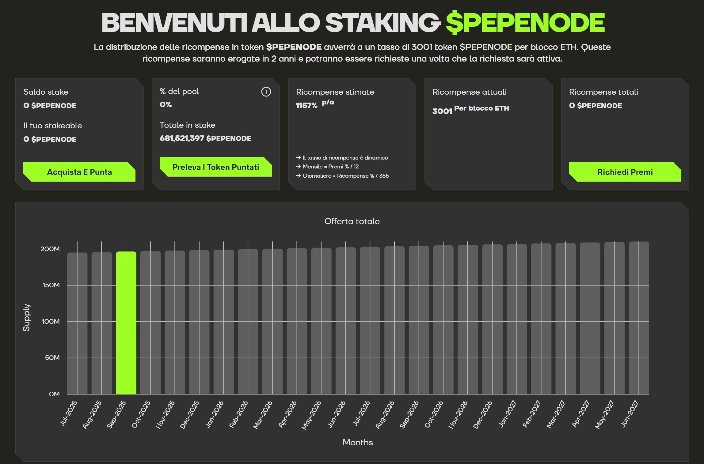 PepeNode cambia questa situazione con ricompense di staking dinamiche attualmente fissate al 1.157% APY, sufficienti a raddoppiare potenzialmente un investimento in poco più di tre mesi, se le condizioni rimangono invariate.