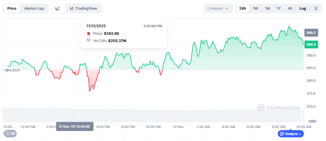 Il prezzo sta ora testando il livello di ritracciamento di Fibonacci al 38,2% ($398,67), con il potenziale per raggiungere i $425 se dovesse mantenere la chiusura sopra i $400.
