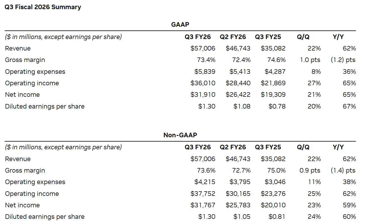 Le paure che l’azienda riportasse delle perdite sono svanite subito. Il colosso dei chip per l’intelligenza artificiale ha riportato utili per 57 miliardi di dollari, sopra le stime di Wall Street ferme a 54,92 miliardi di dollari, e un utile per azione diluito di 1,30 dollari, superiore all’1,25 atteso. Il gross margin adjusted si è attestato al 73,6%.