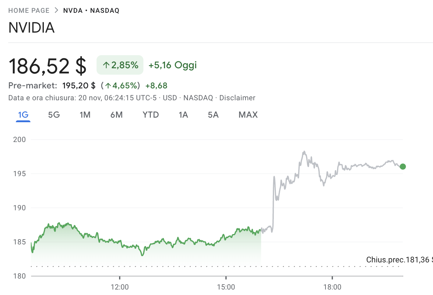 Le azioni NVIDIA sono balzate di circa il 6,5%, portando il titolo oltre i 198 dollari già all’inizio della conference call sui risultati.