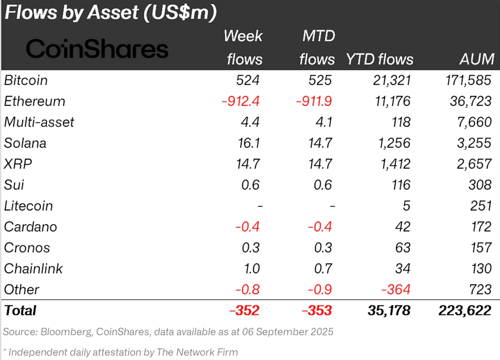 Nel corso degli ultimi sette giorni, i prodotti di investimento in criptovalute hanno registrato deflussi per 352 milioni di dollari, mentre i volumi di scambio sono crollati del 27%. Tuttavia, gli afflussi dall’inizio dell’anno (YTD) rimangono robusti a 35,2 miliardi di dollari.