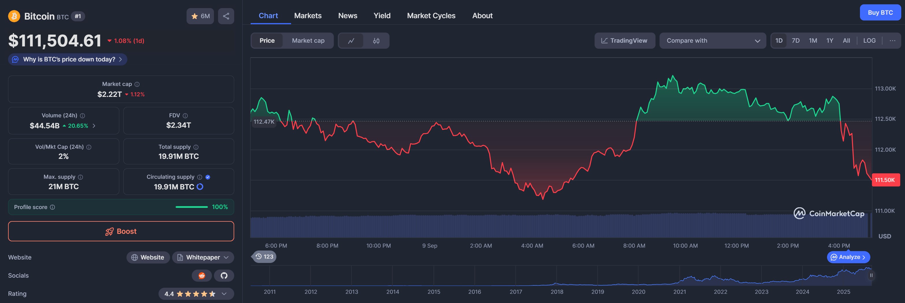 Al momento della pubblicazione dell’articolo, Bitcoin era scambiato a 111.504 dollari, con un calo dell’1,08% nelle ultime 24 ore.