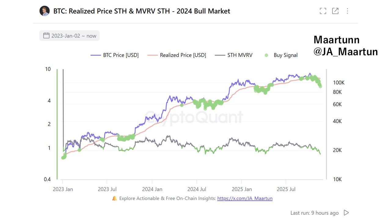 L’analisi di CryptoQuant mostra che il rapporto tra guadagni e vendite degli holder a breve termine è scivolato verso 0,97, un livello considerato estremamente basso.