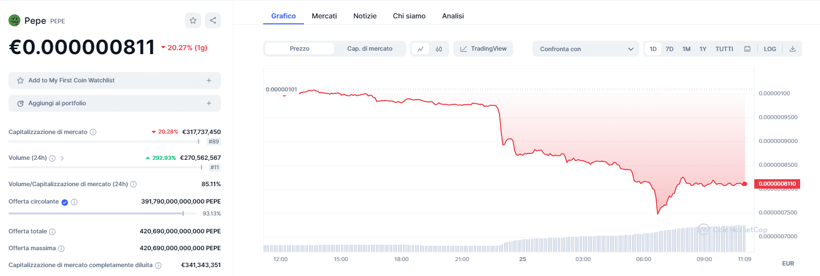 Pepe Coin è passato a 0,000001050 dollari, per poi precipitare rapidamente a nuovi minimi giornalieri attorno a 0,0000009 dollari.