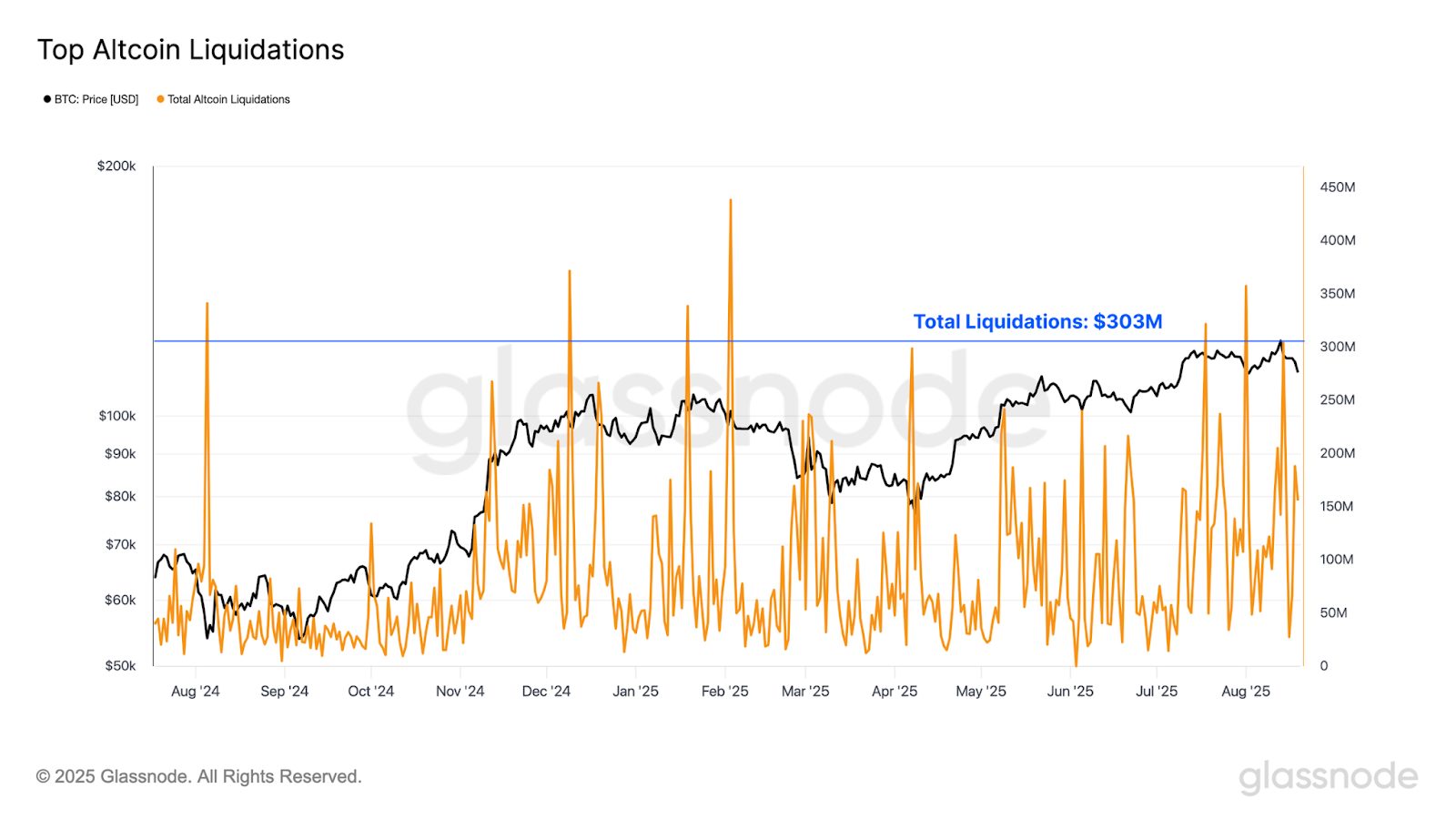 Le liquidazioni combinate delle principali altcoin hanno raggiunto un picco di 303 milioni di dollari al giorno, più del doppio rispetto a quelle dei futures su Bitcoin.