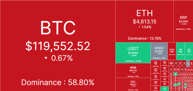 Nella notte la crypto di maggior valore ha toccato i 124.400 dollari, ma poche ore dopo è scivolato sotto la soglia psicologica dei 120.000. Ethereum, XRP e gran parte delle altcoin hanno seguito la discesa.