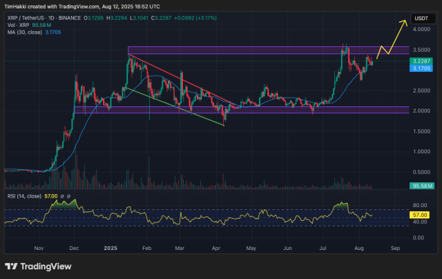 Il token ha seguito una forte traiettoria rialzista, raggiungendo 3,65 $ il 18 luglio e stabilendo un nuovo massimo storico (ATH) per la prima volta dal 2018, prima di ritirarsi di circa il 14,3% fino al prezzo odierno. Nonostante il ritracciamento, XRP è comunque aumentato del 14% nell’ultimo mese, mentre Bitcoin – leader di mercato con una capitalizzazione di 2.000 miliardi di dollari – è rimasto praticamente invariato.