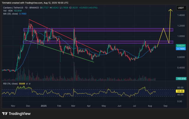 Da un punto di vista tecnico, ADA si sta consolidando all’interno di un cuneo discendente dalla fine del 2024. Una mossa decisa al di sopra della resistenza di $1,10 potrebbe preparare il terreno per arrivare a $1,50 entro l’autunno. Raggiungere l’obiettivo di $6 raddoppierebbe il precedente ATH di ADA del 2021, pari a $3,09.