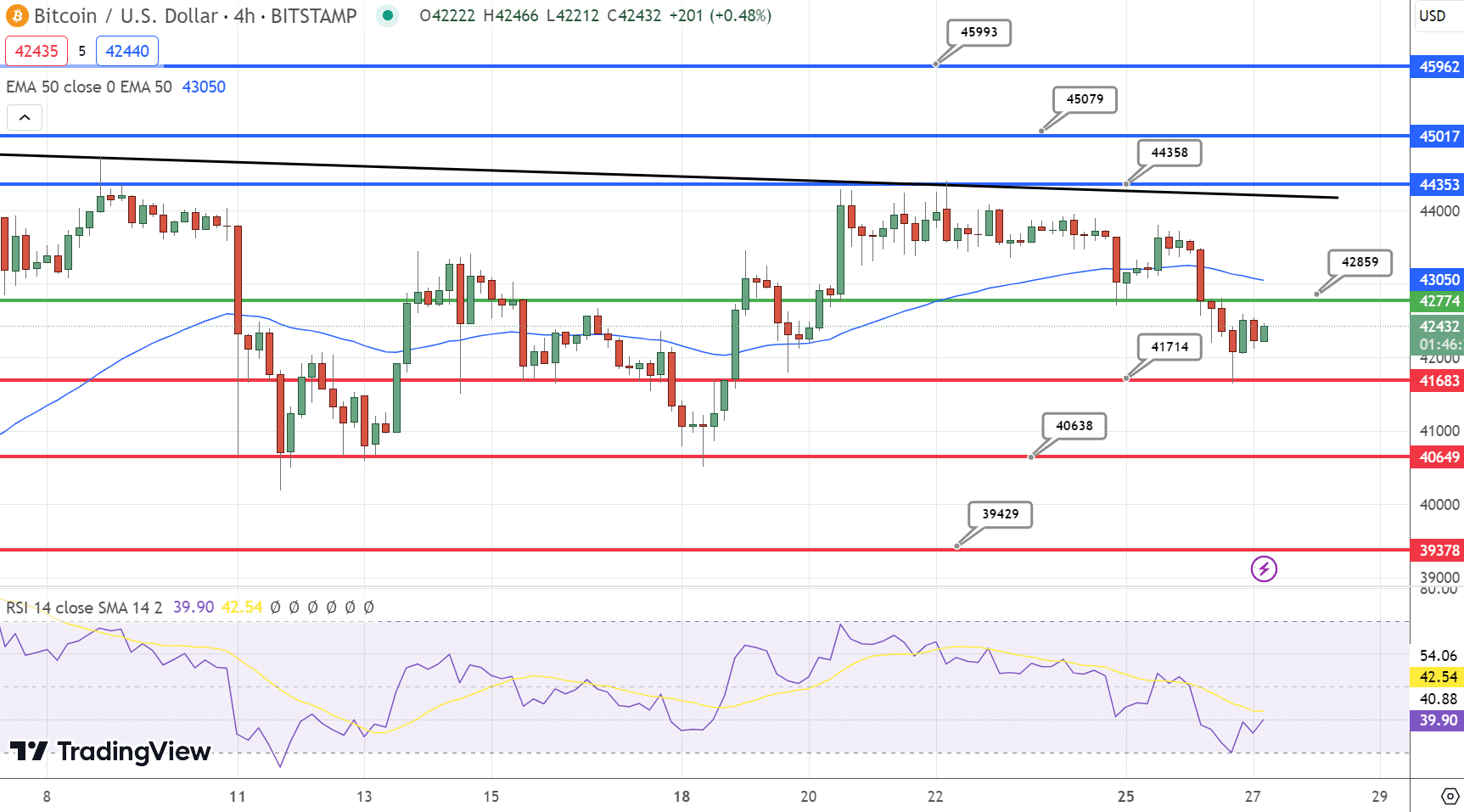 Bitcoin non perde il suo ruolo dominante all’interno del complesso mercato crypto. Il 27 dicembre, la valuta digitale presenta un quadro tecnico complesso. In questo momento Bitcoin sta attraversando livelli cruciali, e il punto critico si colloca a 42.800$.