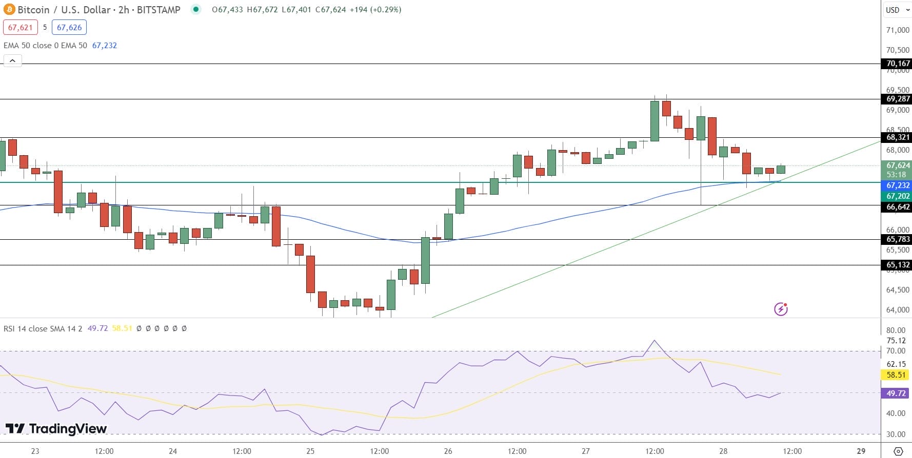 Attualmente, Bitcoin sta vivendo un trend al rialzo. È scambiato a $67.624 con un lieve aumento dello 0,29%. Il grafico a 2 ore indica diversi livelli di prezzo chiave che gli operatori dovrebbero monitorare attentamente.