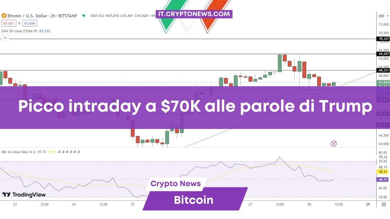 Bitcoin (BTC), la prima criptovaluta al mondo, ha sperimentato volatilità nella giornata di oggi. Ha faticato a mantenere il suo slancio iniziale che l’ha portato sopra i 70.000 dollari per attestarsi intorno a $67.624.