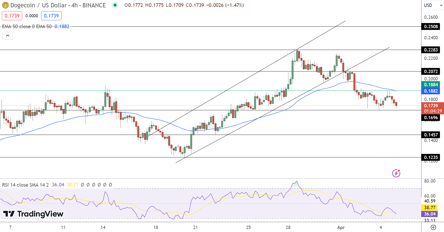 Gli indicatori tecnici, tra cui l’indice di forza relativa (RSI) a 36 e la media mobile esponenziale (EMA) a 50 giorni a 0,1882, suggeriscono uno slancio ribassista. Infatti, Dogecoin ha precedentemente violato un canale ascendente intorno al livello di 0,2070 dollari e ora il sentimento è cambiato.