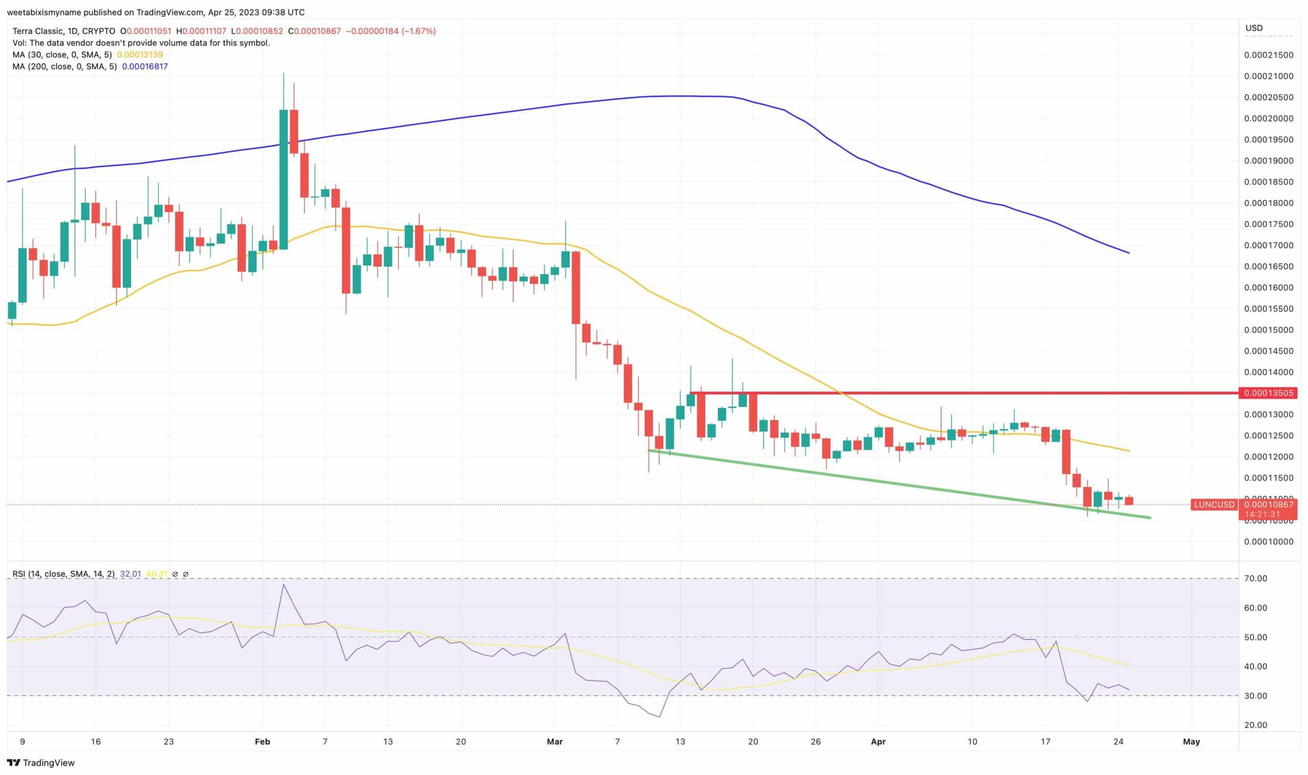 Inoltre, il fatto che LUNC continui a scendere attraverso i livelli di supporto – e lo ha fatto praticamente per tutto l’anno – dipinge il quadro di un’altcoin in declino terminale.