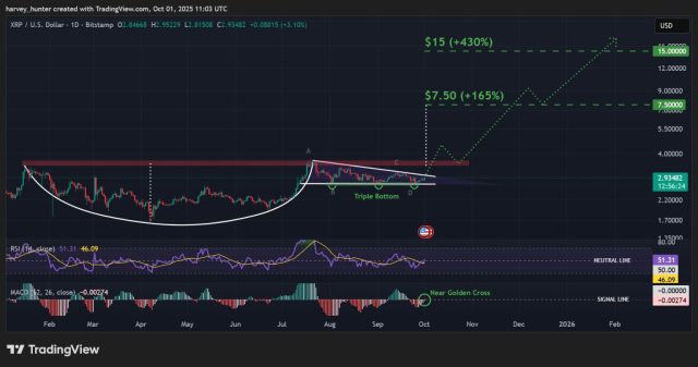 Con i tagli dei tassi d’interesse statunitensi che alimentano la domanda nei mercati di investimento USA e una maggiore esposizione TradFi, un proseguimento della bull run fino al 2026 potrebbe estendersi fino a 15 dollari, generando un guadagno del 430%.