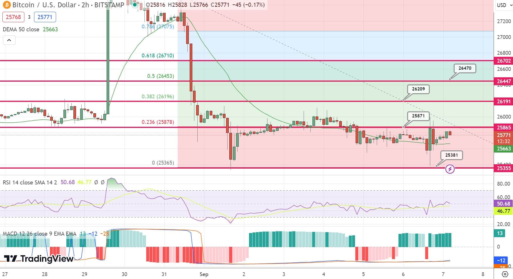 In seguito a questi tentativi falliti, la principale criptovaluta ha assistito a un ripiegamento ribassista, scivolando sotto la soglia dei 25.650 dollari. Tuttavia, i tori resistenti hanno mantenuto il supporto di 25.350 dollari, permettendo a Bitcoin di recuperare il territorio oltre i 25.500 dollari.