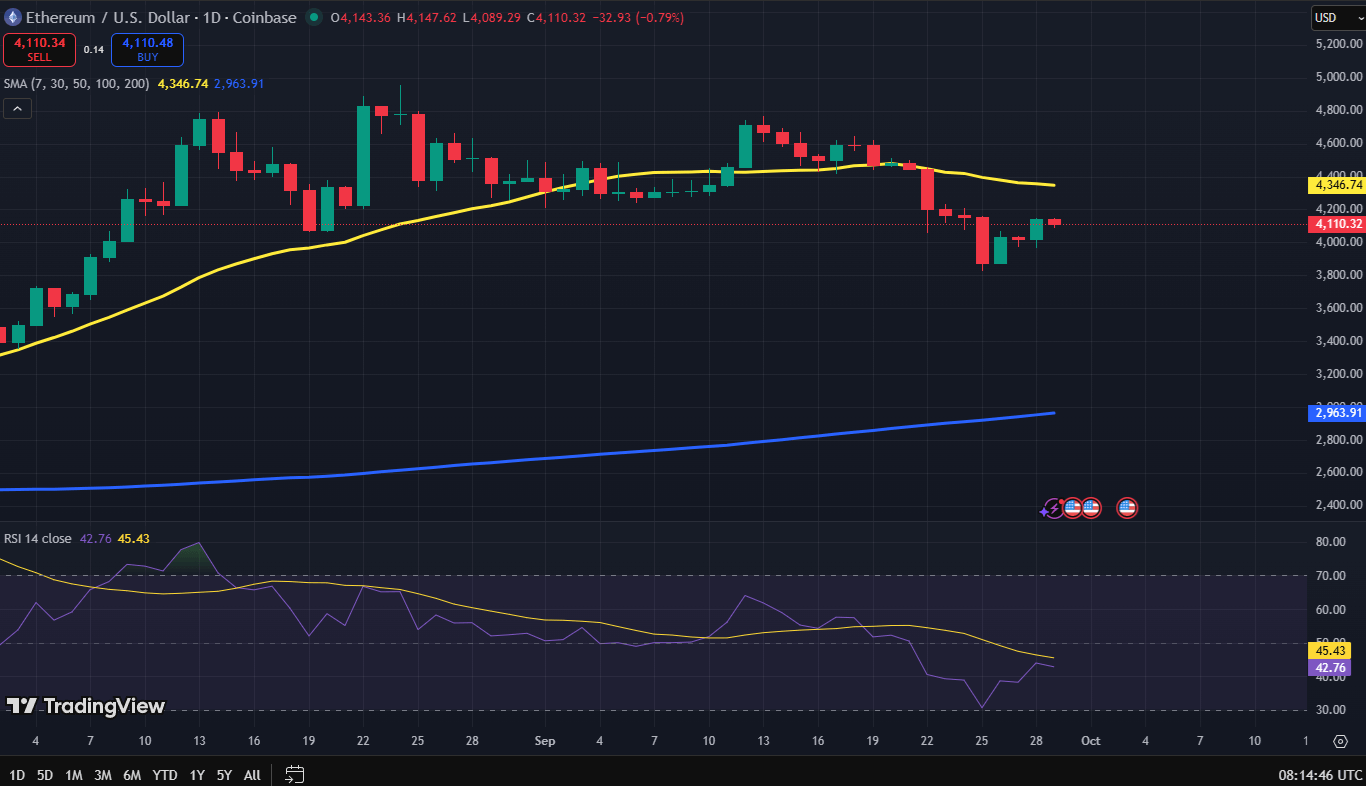 Oggi il prezzo di Ethereum è salito del 2,4% a 4.110 dollari, il che suscita aspettative positive per i prossimi mesi e riaccende le speranze di una ripresa dell’altseason a ottobre.