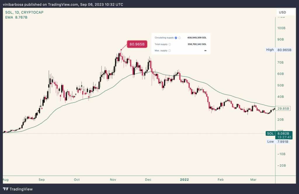 Solana (SOL) ha raggiunto un prezzo massimo storico di 259,96 dollari il 6 novembre 2021 e un market cap massimo storico di 80,965 miliardi di dollari alla stessa data.