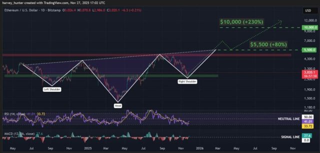 La proiezione tecnica di questa configurazione suggerisce un ritorno verso l’area dei 5.500 dollari, che rappresenta la cosiddetta “scollatura” del pattern. Un target che implicherebbe un guadagno dell’80% rispetto ai valori attuali e che potrebbe aprire la strada a una nuova fase di price discovery per ETH. Il precedente massimo storico, vicino ai 4.900 dollari, risulterebbe superato, con spazio per una nuova accelerazione rialzista.