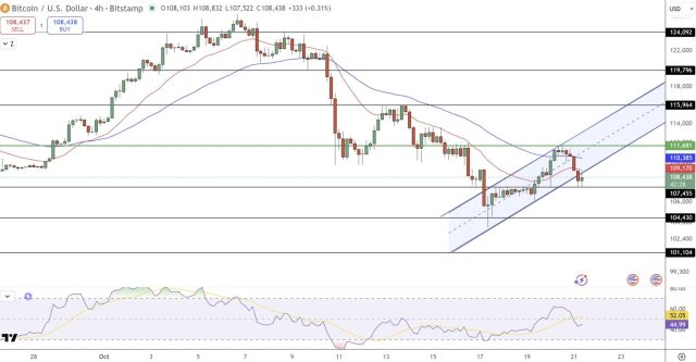 Bitcoin testa il supporto a 107.400 dollari mentre i rialzisti difendono il canale crescente