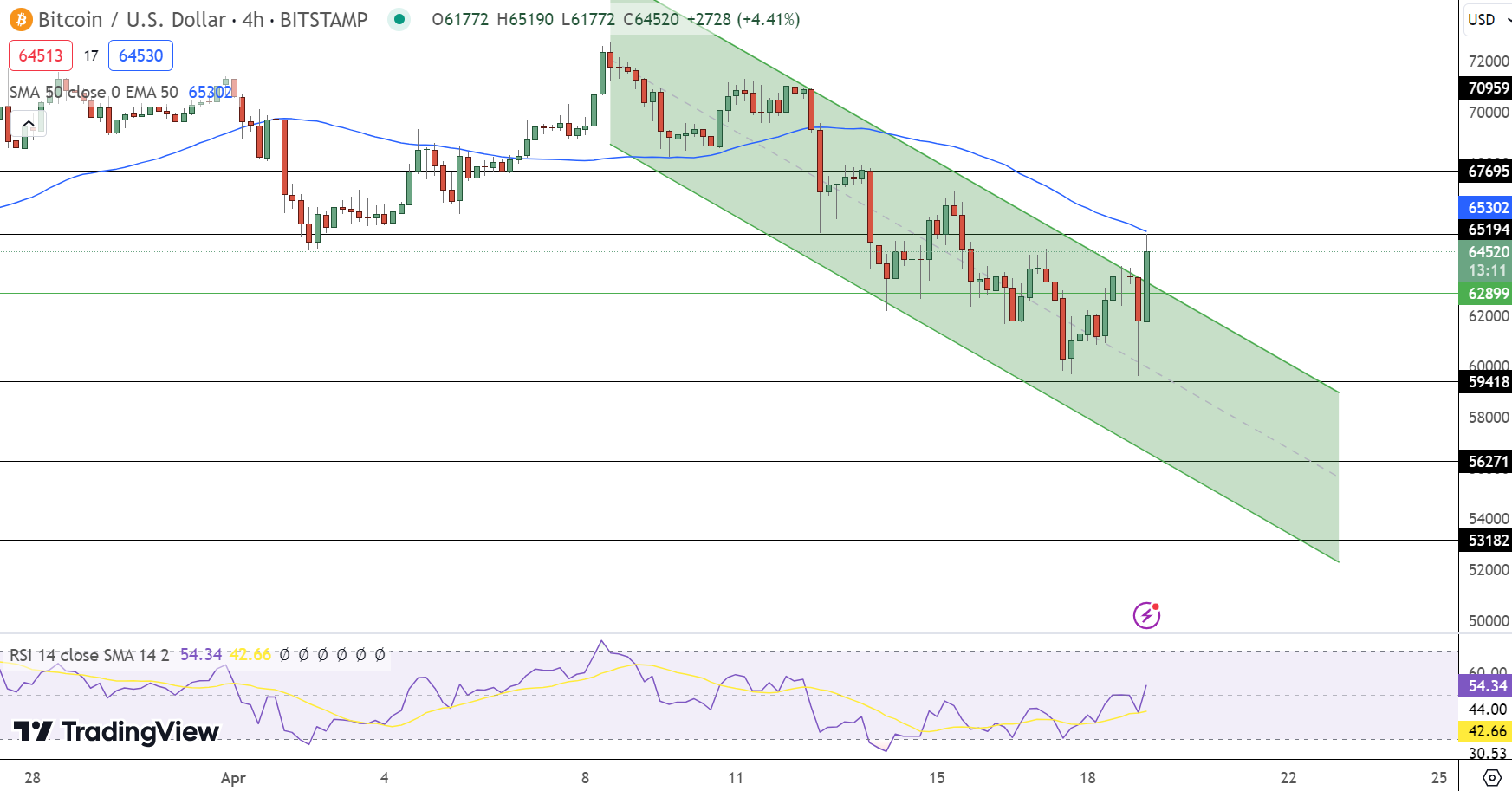 La coppia BTC/USD è attualmente quotata a 64.520 dollari, con un calo dell’1,65%. L’assetto tecnico della criptovaluta presenta prospettive miste all’interno di un intervallo di trading ristretto. Il punto cardine di oggi è fissato a 62.899 dollari, che funge anche da punto di riferimento per la direzione a breve termine.