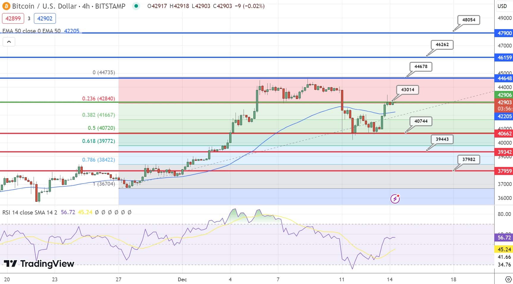 Nell’analisi tecnica di oggi 14 dicembre per Bitcoin (BTC/USD), la criptovaluta è scambiata intorno alla soglia cruciale di 42.900 dollari.