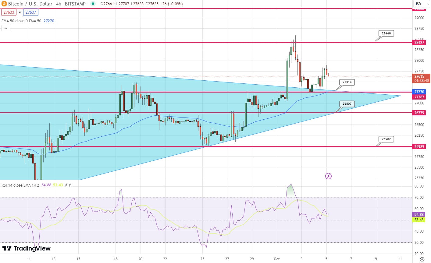Osservando il grafico a 4 ore di TradingView, il prezzo di Bitcoin mostra livelli di prezzo chiave che richiedono attenzione. Il punto di snodo per l’asset, al momento, si trova a 27.500 dollari.