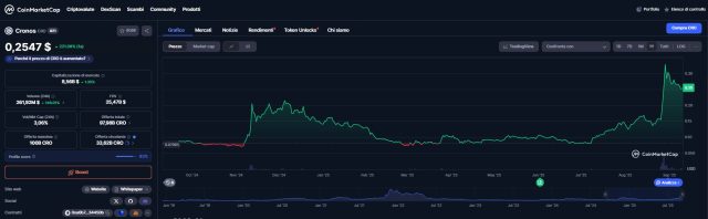 Le proiezioni tecniche suggeriscono quindi un potenziale ribasso di oltre il 50% dai massimi recenti, con livelli di rischio intorno a 0,12-0,13 $. Secondo gli analisti, CRO dovrebbe saliere sopra gli 0,35 $ per riattivare la spinta rialzista. Al contrario, un calo sotto gli 0,20 $ potrebbe innescare ulteriori perdite.