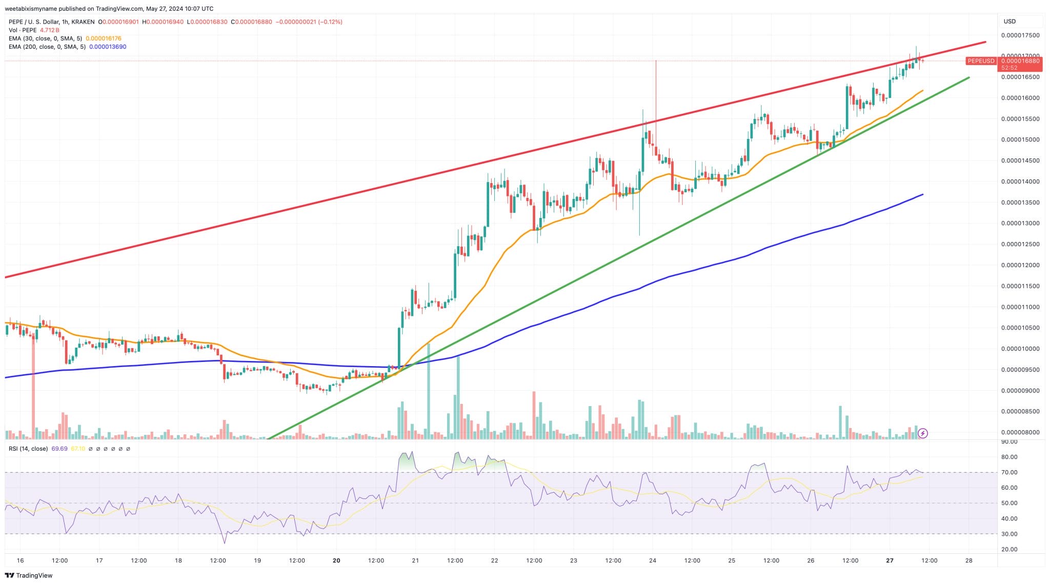 Il grafico del prezzo di PEPE è molto rialzista al momento, con la moneta che mantiene un forte slancio da quasi una settimana.