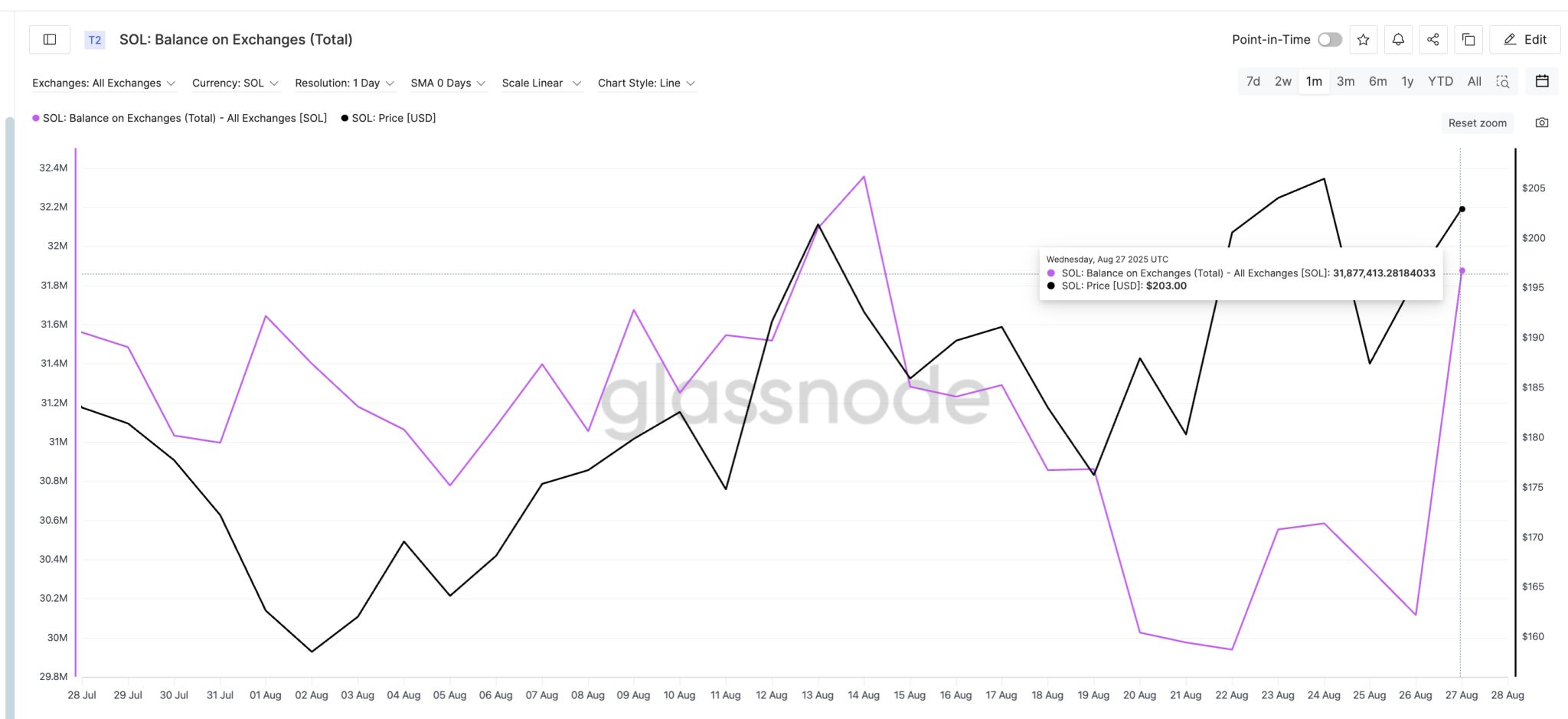 Di recente, i dati on-chain mostrano che il numero di token SOL sulle piattaforme di trading è notevolmente aumentato. Il 22 agosto il contatore era a 29,94 milioni di SOL, cinque giorni dopo era a 31,87 milioni di SOL. Si tratta di un aumento di quasi 1,94 milioni di token in breve tempo avvenuto quando il prezzo di Solana si trovava a circa 213 dollari, rappresentando un potenziale pool di vendita di 412 milioni di dollari.