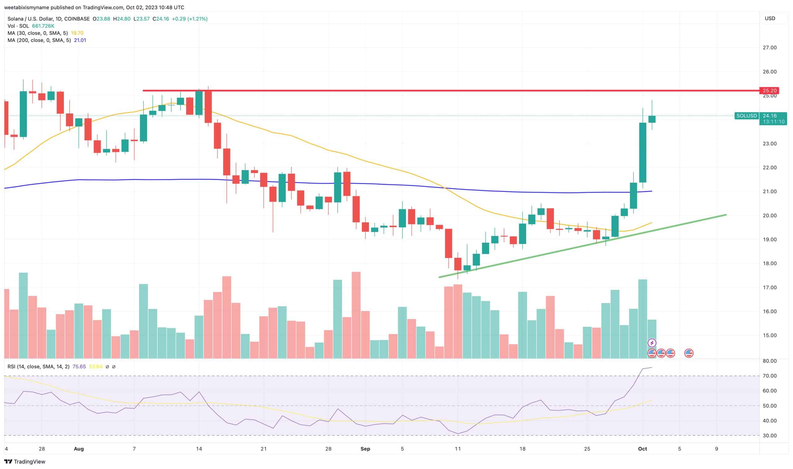 Sarà particolarmente interessante vedere se SOL riuscirà a superare l’attuale livello di resistenza (in rosso) di circa 25 dollari, con un breakout sostenuto se riuscirà a farlo nei prossimi due giorni.