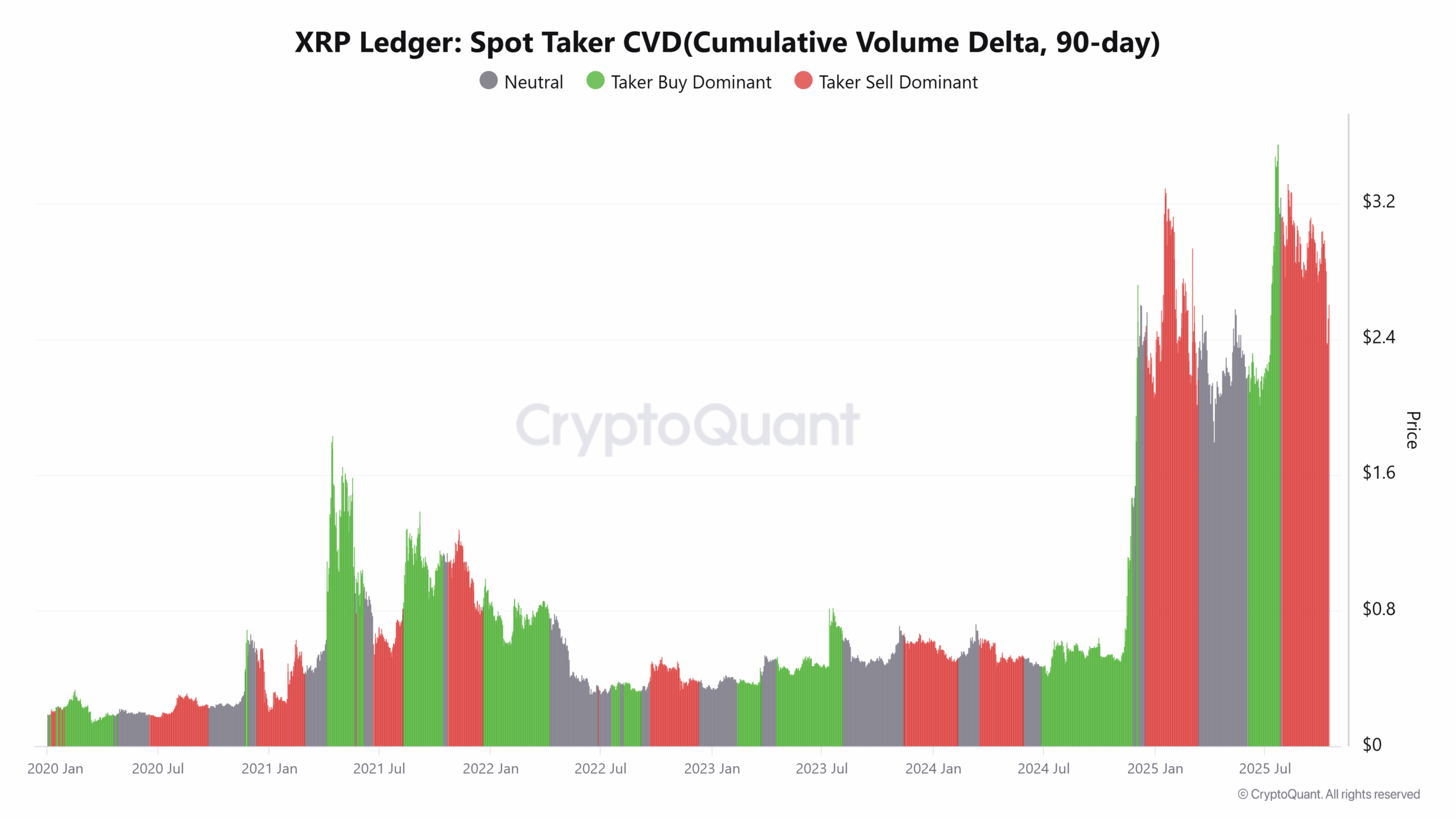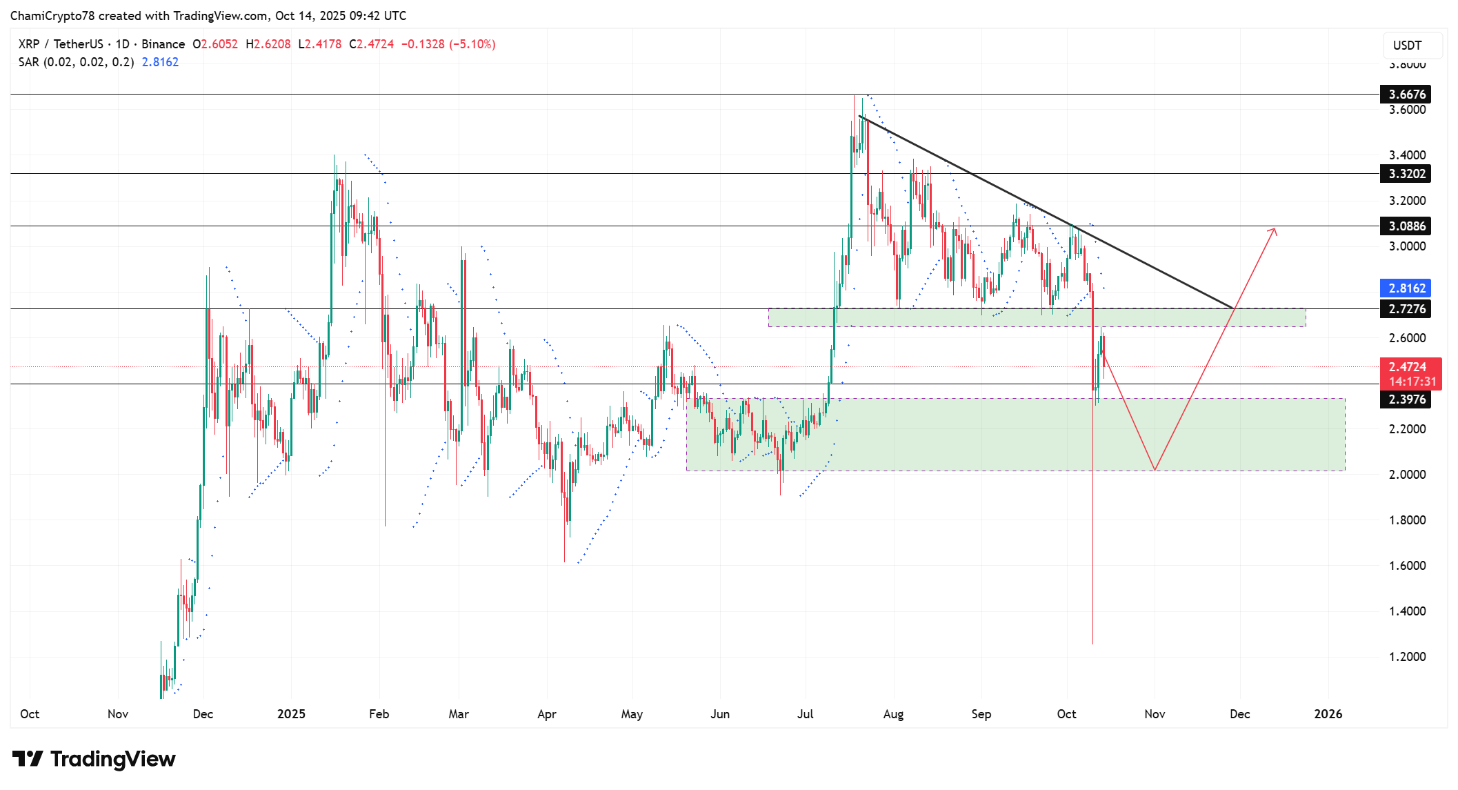Questa formazione discendente, spesso accompagnata da un declino dei volumi di trading, indica una probabile rottura al ribasso, con XRP che potrebbe scendere sotto il livello di supporto. Il crollo del mercato crypto avvenuto il 10 ottobre ha aggravato il contesto, spingendo XRP sotto la precedente zona di accumulo.