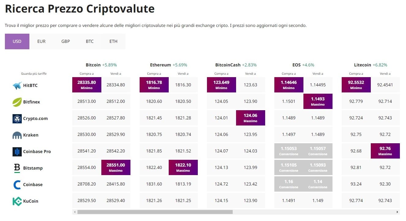 Trova il prezzo migliore per acquistare/vendere criptovalute
